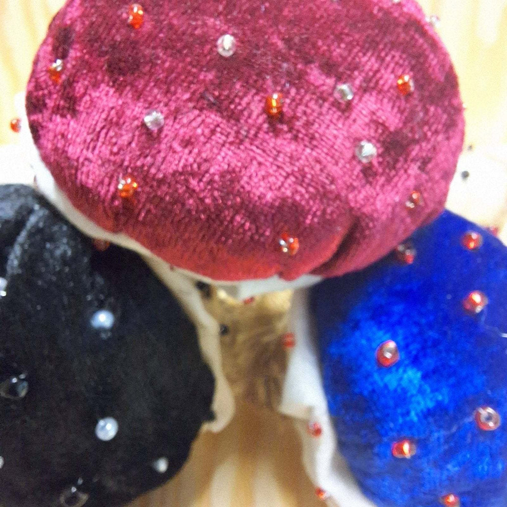 Three Handmade Velvet Mushroom Keepsakes – Beaded Hanging Ornament or Pincushion