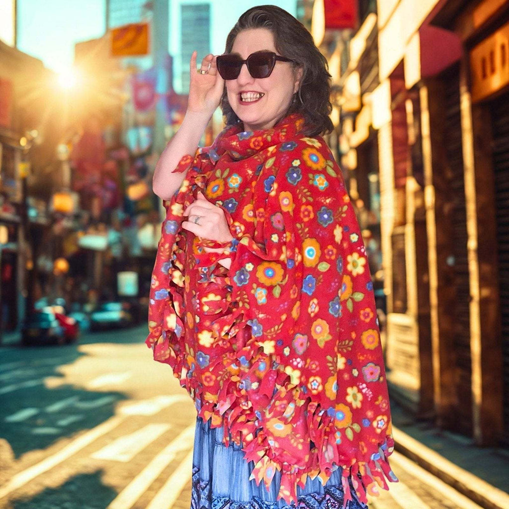 This rich red floral fleece poncho is a slightly more dramatic cousin to the minimalist pieces in the Minimalist Circle Fleece Poncho collection.